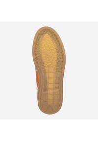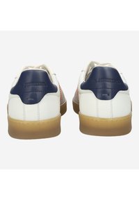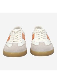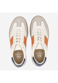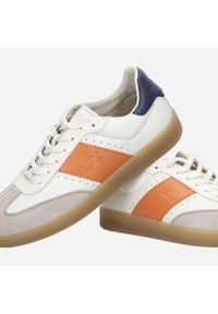 Biały skórzany sneaker z pomarańczowym bocznym panelem, beżowym noskiem z zamszu, granatowym piętą i gumową podeszwą, pokazany z boku z sznurowadłami.