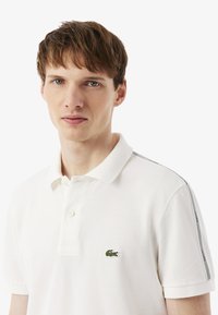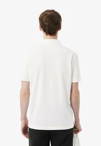 Biała koszulka polo z zielonym logo krokodyla, krótkimi rękawami i klasycznym kołnierzykiem; zestawiona z czarnymi spodniami, trzymana białą tkaniną.