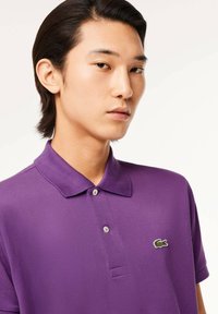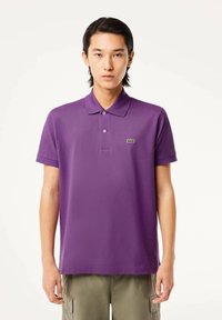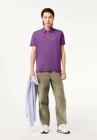 Fioletowa koszula polo z bawełny z trzema guzikami, krótkimi rękawami i małym zielonym haftowanym logo na piersi. Noszona z zielonymi spodniami cargo.
