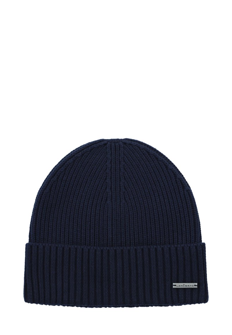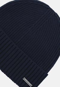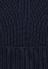 Granatowa dzianinowa czapka z widocznym splotem i podwiniętym mankietem. Na boku znajduje się mała, srebrna metka z logo.