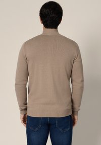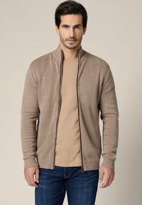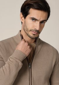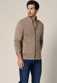 Mężczyzna ubrany w beżowy sweter rozpinany na zamek, nałożony na jasnobrązową koszulę i niebieskie dżinsy, stojący na tle jednolitego jasnego tła.