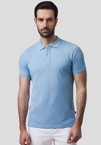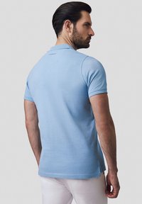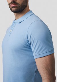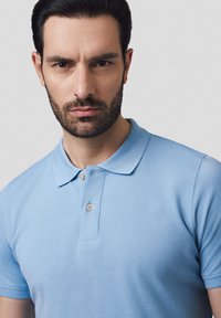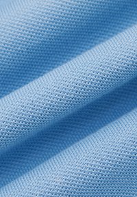 Jasnoniebieska koszulka polo wykonana z bawełny, z klasycznym kołnierzykiem, krótkimi rękawami i zapinana na trzy guziki. Widoczne są również białe spodnie.