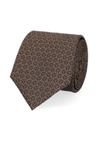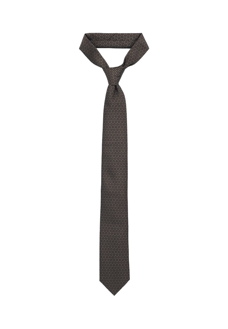 Ciemnobrązowy krawat z geometrycznym wzorem w jaśniejszym odcieniu. Materiał wydaje się gładki, ma klasyczny krój i zwężony koniec.