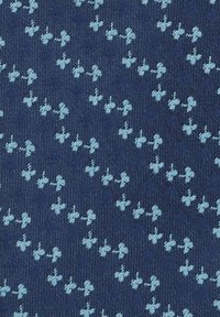 Granatowy krawat wykonany z gładkiego materiału, ozdobiony powtarzającym się białym wzorem florystycznym. Ma spiczasty koniec i klasyczny wąski krój.