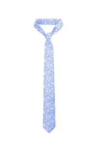 Krawat w kwiaty z brązowym tłem, z niebieskimi i jasnoróżowymi kwiatami, o teksturowanej tkaninie i zwiniętym designie.