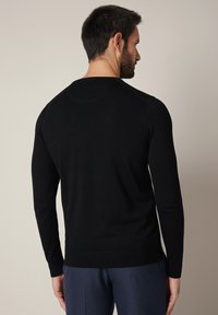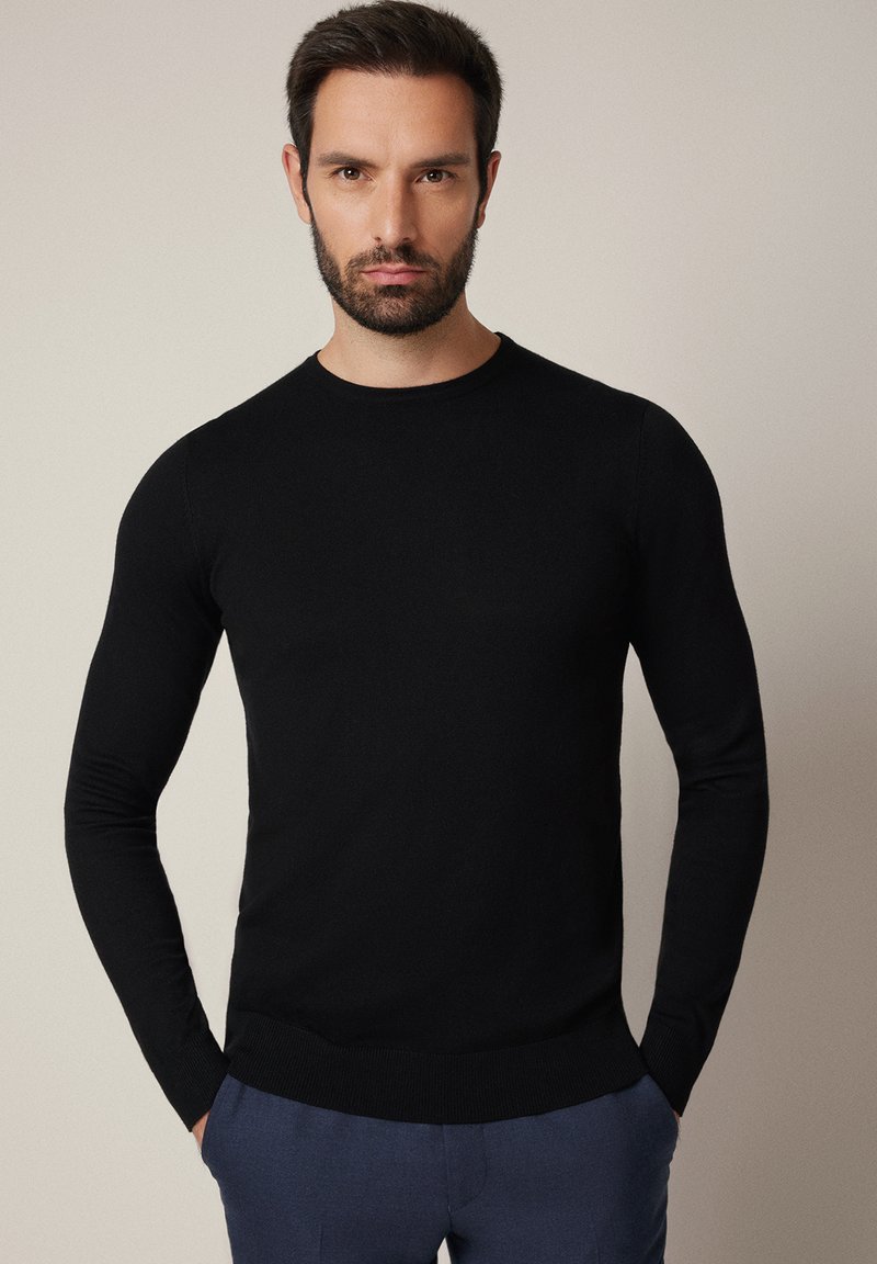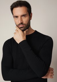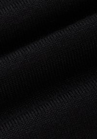 Czarny sweter z długim rękawem wykonany z miękkiego dzianinowego materiału, z okrągłym dekoltem oraz ściągaczami na mankietach i dole. Dopasowany fason o gładkiej fakturze.