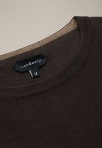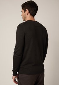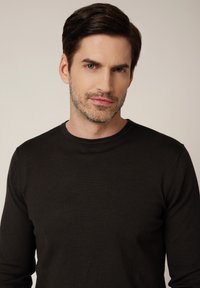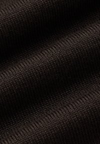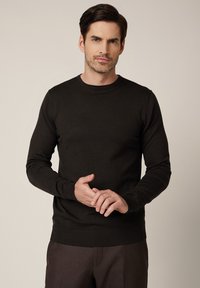 Ciemnobrązowy sweter dziany z okrągłym dekoltem, długimi rękawami oraz ściągaczami na mankietach i u dołu. Gładka tekstura z dopasowanym fasonem.