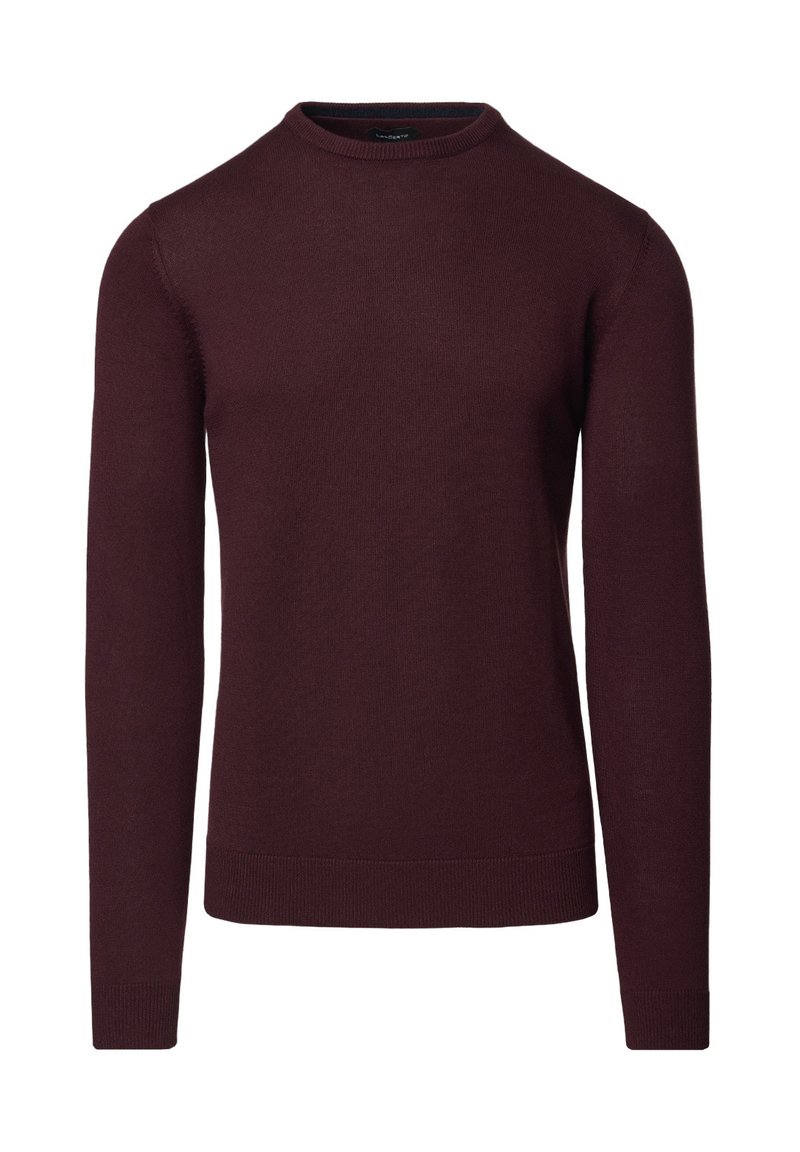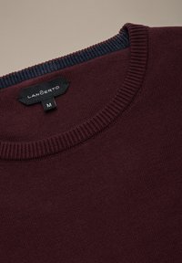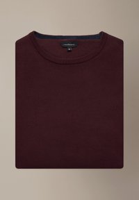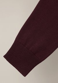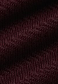 Bordowy sweter z dzianiny z długimi rękawami, okrągłym dekoltem oraz ściągaczami na rękawach i dole. Gładka tekstura, lekka tkanina, prosty fason.
