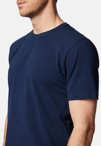 Granatowa bawełniana koszulka z okrągłym dekoltem i krótkimi rękawami, charakteryzująca się gładką fakturą i klasycznym krojem, na jednolitym tle.