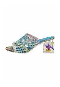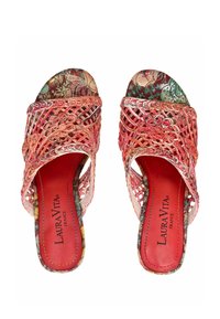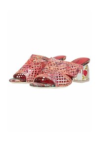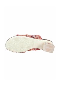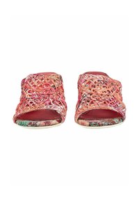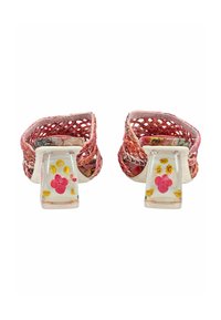 Różowe, otwarte mule z plecionym wzorem, wkładką z kwiatowego materiału oraz przezroczystym, blokowym obcasem z zatopionymi czerwonymi i żółtymi kwiatami.
