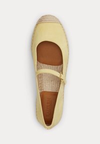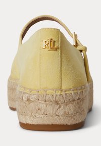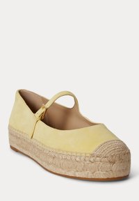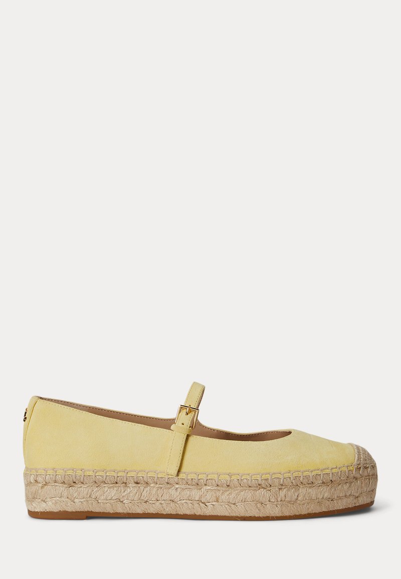 Żółte zamszowe espadryle Mary Jane z plecioną platformą z juty i paskiem z złotą klamrą, pokazane z profilu.