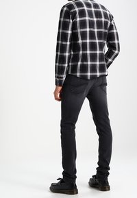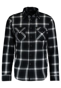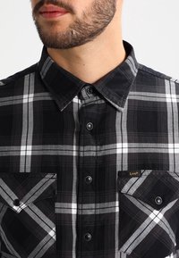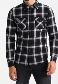 Mężczyzna ubrany w koszulę na guziki w czarno-białą kratę z dwoma kieszeniami na piersi, w połączeniu z ciemnymi dżinsami.