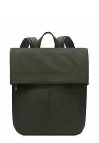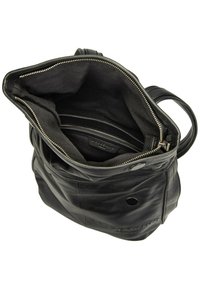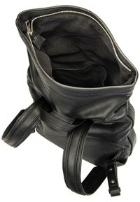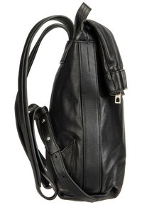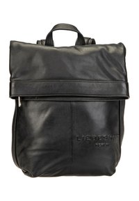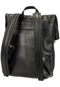 Czarny skórzany plecak z zakładaną klapą na górze, pojedynczym uchwytem i wytłoczonym napisem "LIEBESKIND BERLIN" na przodzie.