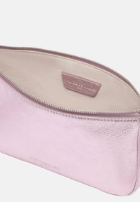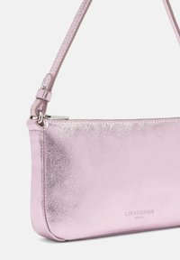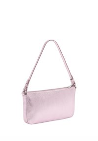 Błyszcząca metaliczna różowa prostokątna torebka z krótkim uchwytem i odpinanym paskiem, wyposażona w zamek błyskawiczny i srebrne okucia.