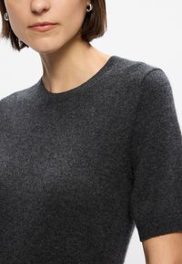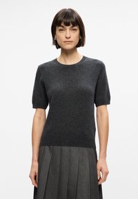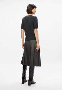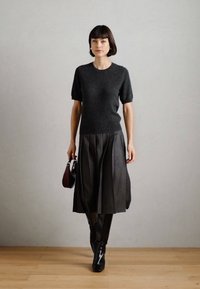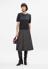 Wełniany sweter w kolorze węgla kamiennego z krótkimi rękawami i okrągłym dekoltem, zestawiony z plisowaną szaro-skalną spódnicą. Miękka tekstura i luźny krój.