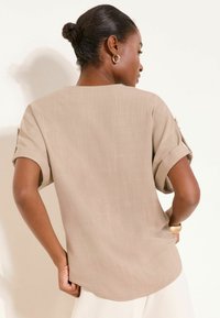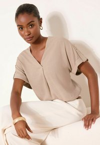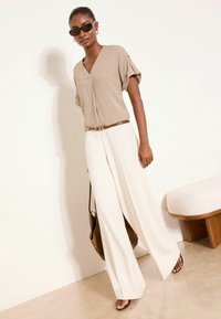 Kobieta ubrana w beżową bluzkę z krótkim rękawem i dekoltem w kształcie litery V, z podwiniętymi mankietami, oraz białe spodnie z wysokim stanem, uzupełnione brązowym paskiem i złotymi kolczykami kołami.