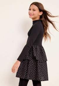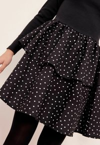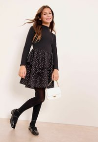Czarna bluzka z długim rękawem w połączeniu z warstwową sukienką w groszki. Przezroczyste rajstopy i błyszczące czarne buty dopełniają stylizację, która zawiera małą białą torebkę.