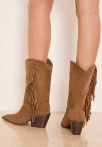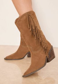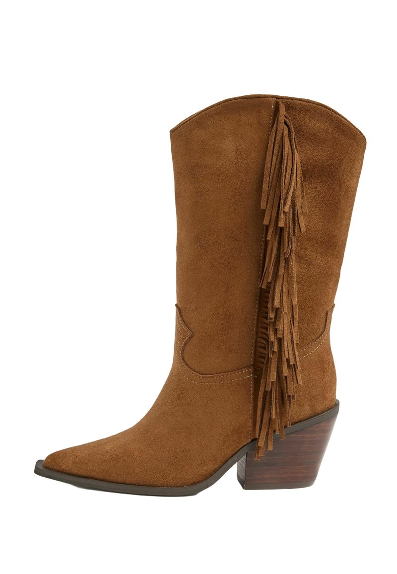 Brązowy zamszowy kowbojski but z frędzlami po boku, szpiczasty czubek i pięta na słupku. Charakterystyczne kontrastowe przeszycia.