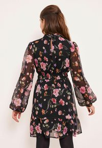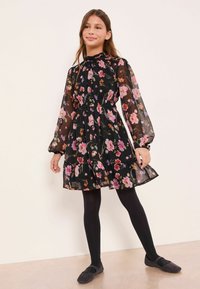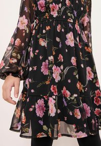 Czarna sukienka w kwiaty z długimi przezroczystymi rękawami, marszczonym dekoltem, talią podkreśloną paskiem i wielowarstwową spódnicą. Ozdobiona kolorowymi kwiatami i miękką fakturą.
