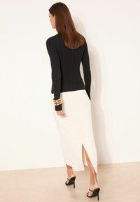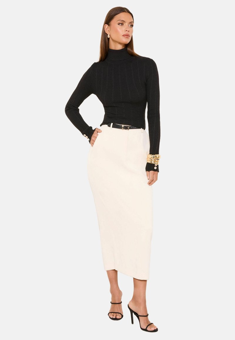 Kobieta ubrana w czarny prążkowany golf, białą spódnicę midi z wysokim stanem, czarny pasek, złote bransoletki oraz czarne sandały na obcasie z odkrytymi palcami, stojąca.