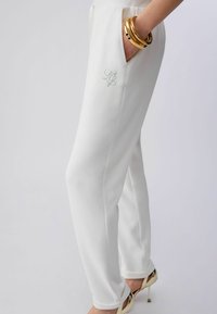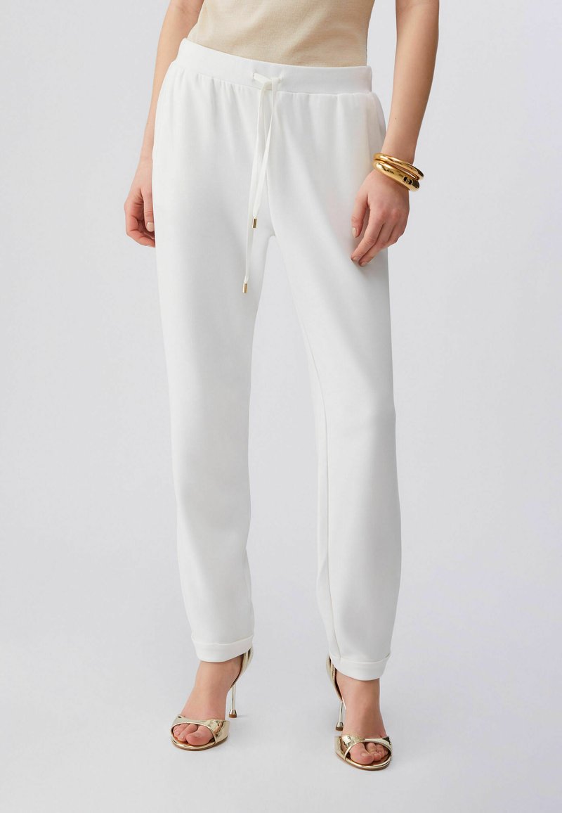 Białe, lekkie spodnie dresowe z elastycznym pasem, sznurkiem do wiązania i ściągaczami przy kostkach. Połączone ze złotymi sandałami na obcasie.