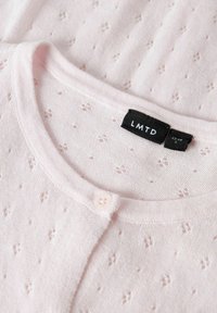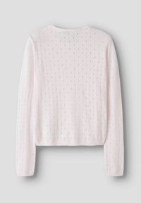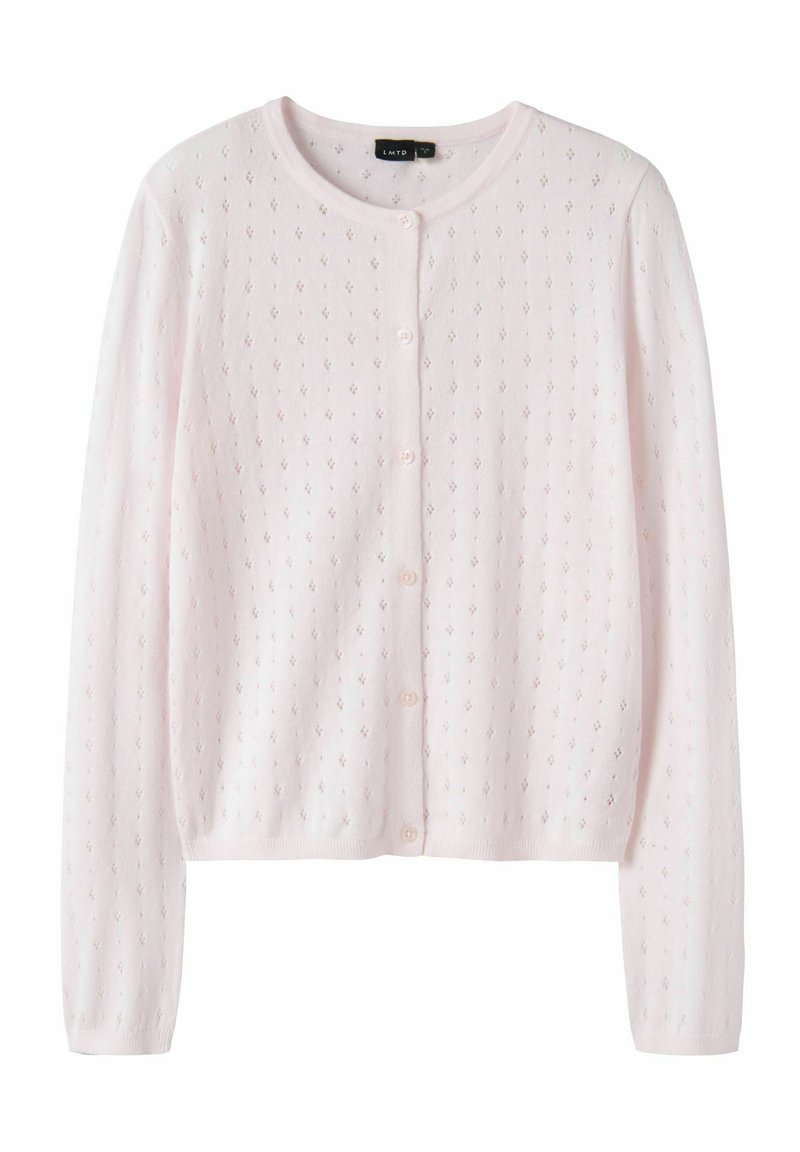 Jasnoróżowy kardigan na długi rękaw z małym wzorem ażurowym i guzikami z przodu, okrągły dekolt oraz ściągacze na rękawach i w pasie.