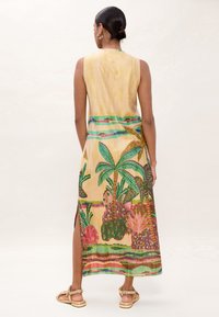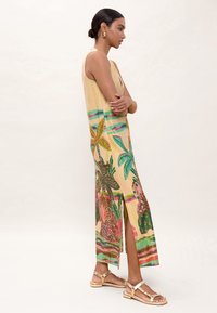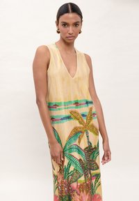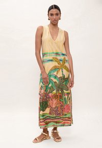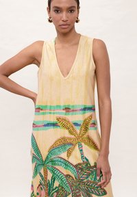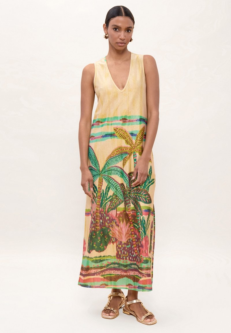 Kobieta w długiej sukience bez rękawów z dekoltem w serek, ozdobionej kolorowym tropikalnym wzorem z palmami, oraz złotych sandałach, stojąca na jasnym tle.