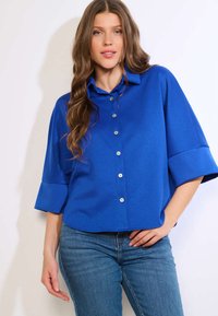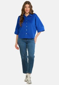 Niebieska, krótka koszula na guziki z miękkiego materiału, z kołnierzykiem typu point i srebrnymi guzikami, zestawiona z dżinsami.
