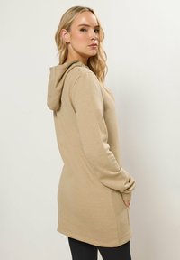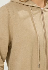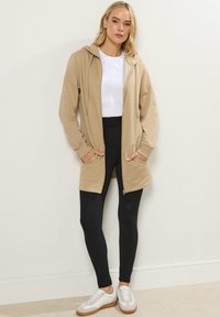 Kobieta w beżowej zip-up bluzie z kapturem na białej koszulce i czarnych spodniach, stojąca na tle jasnego, jednolitego tła.