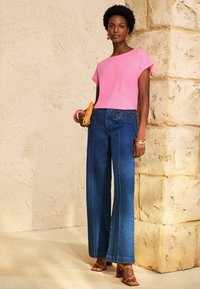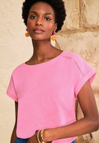 Kobieta o krótkich kręconych włosach, ubrana w różową koszulę, niebieskie dżinsy, kolorowe kolczyki i bransoletki, pozująca z jedną ręką na biodrze.