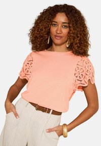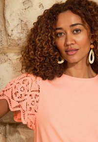 Kobieta o kręconych brązowych włosach ma na sobie brzoskwiniowy top z koronkowymi rękawami, beżowe spodnie z wysokim stanem, brązowy pasek, złotą bransoletkę i kolczyki-koła.
