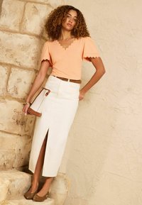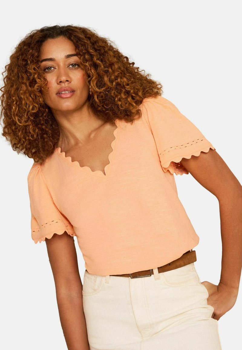 Kobieta o kręconych włosach, ubrana w morelowy top z krótki rękawem z falowanym brzegiem oraz białe spodnie z wysokim stanem i brązowym paskiem.