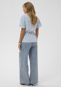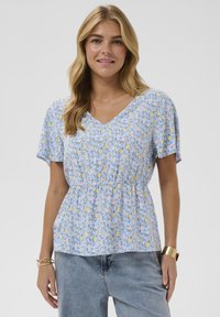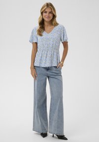Kobieta o blond włosach, ubrana w niebieską bluzkę w kwiaty z krótkim rękawem oraz jasnoniebieskie dżinsy, stojąca na tle gładkiego szarego tła.