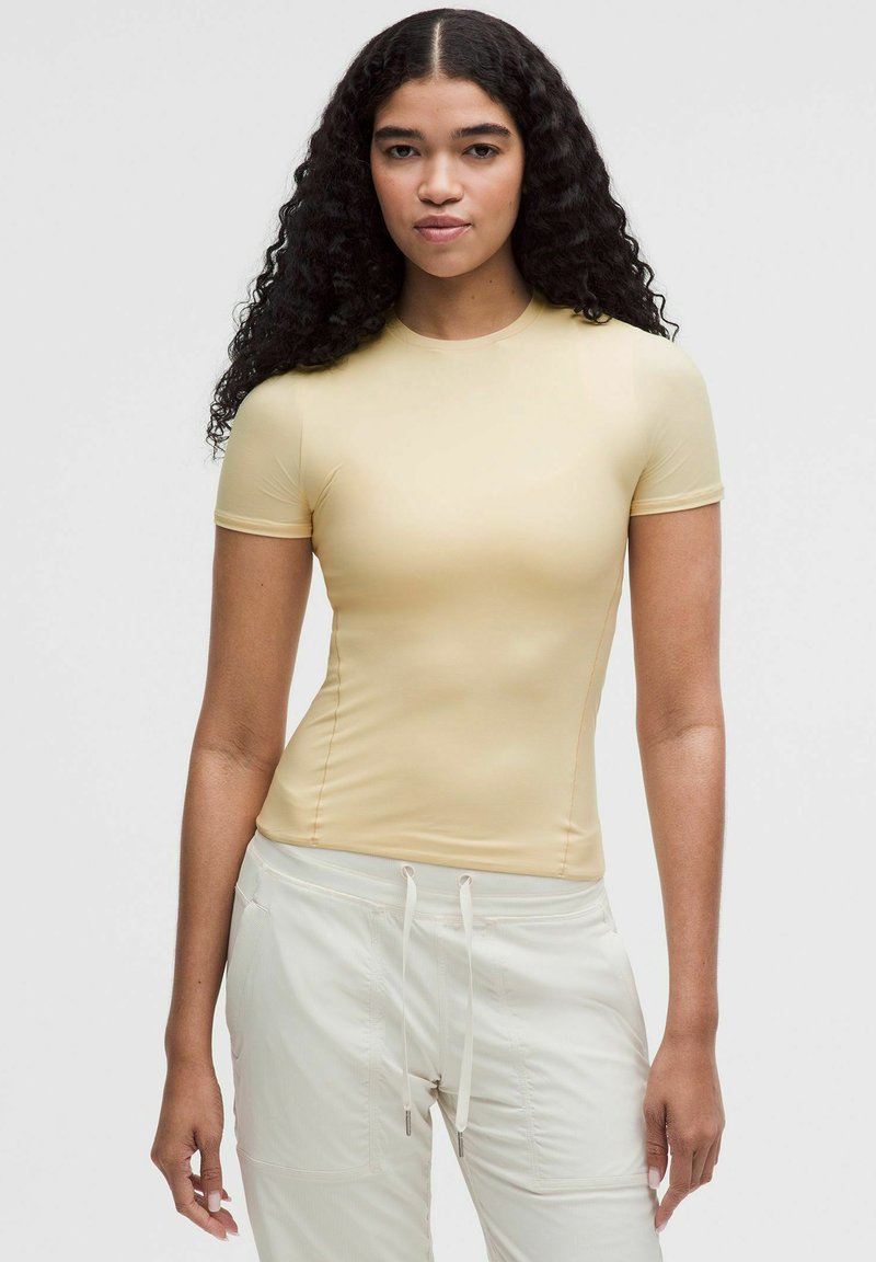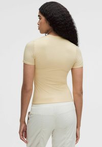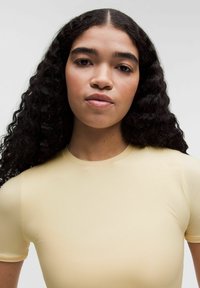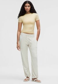 Kobieta z długimi kręconymi włosami nosi dopasowany beżowy top z krótkim rękawem i białe spodnie z troczkami, stoi na tle jednolitego jasnoszarego tła.