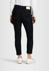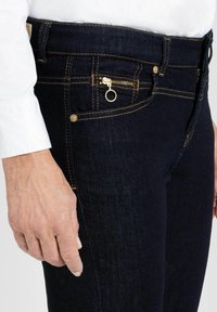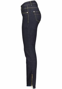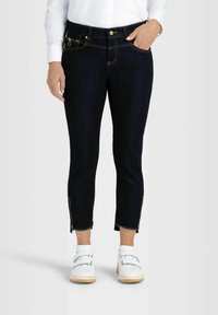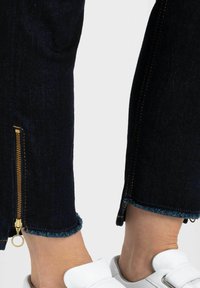 Ciemnoniebieskie dżinsy mają slim fit, długość do kostek z zamkami na dole i kontrastowe złote przeszycia. W zestawie z białymi trampkami.