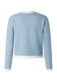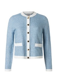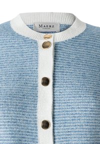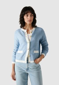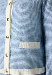 Kobieta o ciemnych, kręconych włosach, ubrana w jasnoniebieski kardigan z białym obszyciem i złotymi guzikami na białej bluzce, pozująca z jedną ręką w kieszeni.