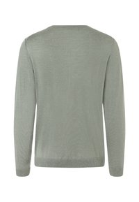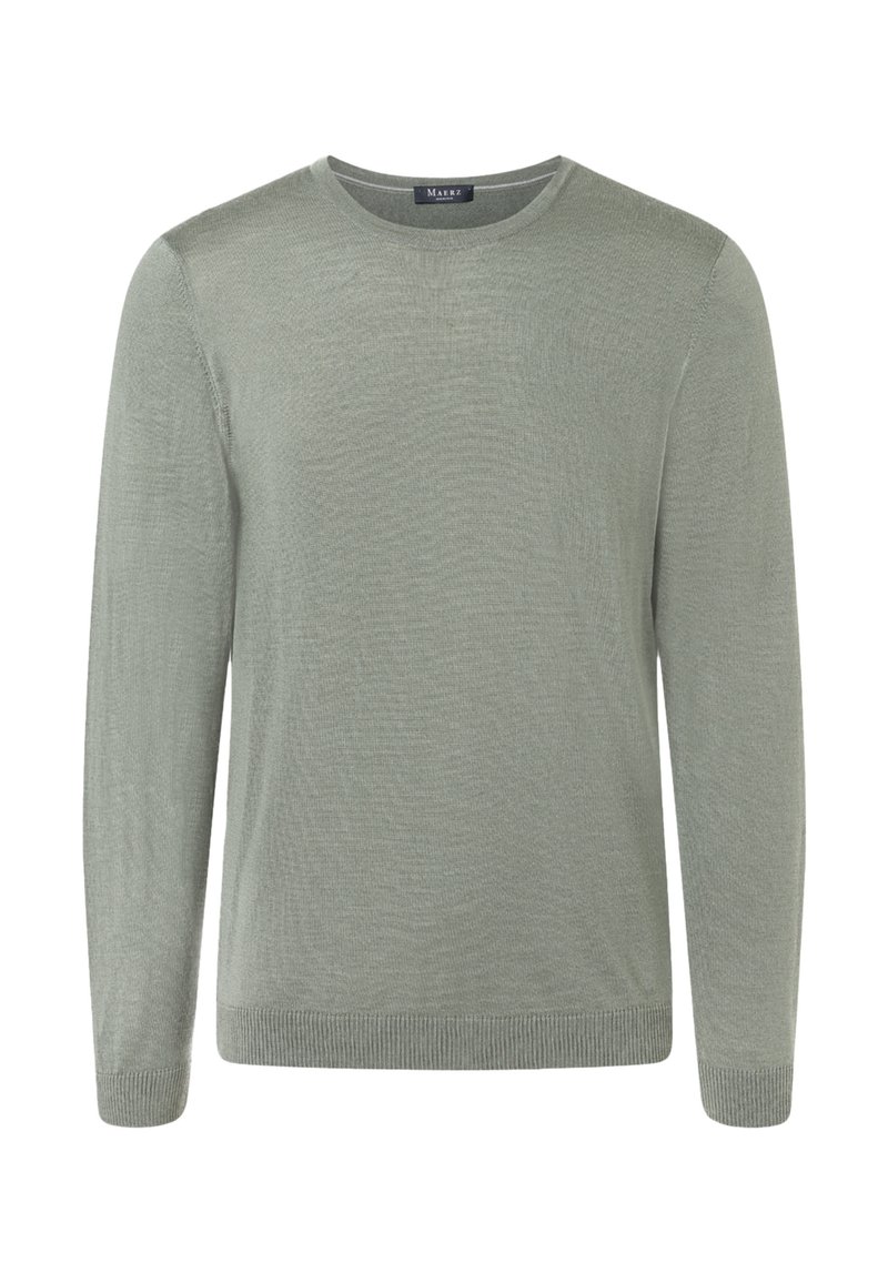 Jasnoszary sweter z długim rękawem i okrągłym dekoltem, z prążkowanymi mankietami i dołem, prezentowany na białym tle.