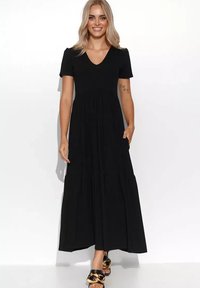 Czarna maxi sukienka z głębokim dekoltem w kształcie V, krótkimi rękawami i wiązanym w pasie. Charakteryzuje się swobodnym materiałem z bocznymi rozcięciami oraz miękką teksturą.