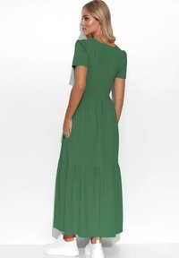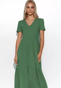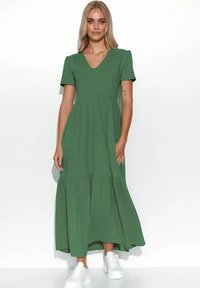Sukienka maxi w oliwkowej zieleni, z dekoltem w serek, krótkimi rękawami, wiązaniem w talii oraz zwiewnym materiałem z warstwowym wykończeniem na dole.