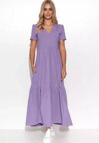 Śliwkowa, plisowana suknia maxi z dekoltem w kształcie V i falbanowymi rękawami. Wykonana z lekkiego materiału, posiada dopasowaną górę i zwiewny dół.