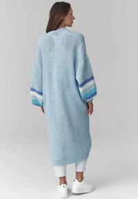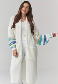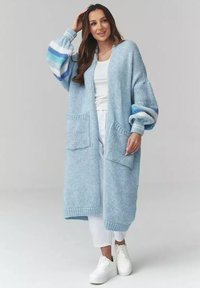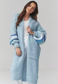 Kobieta ubrana w długi, jasnoniebieski, dziergany kardigan z dużymi kieszeniami i wielokolorowymi paskowanymi rękawami, na białej bluzce i spodniach.