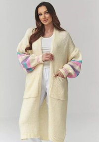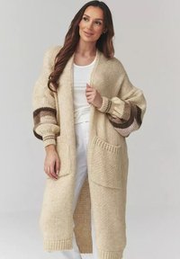 Jasno beżowy kardigan o prążkowanej fakturze, z otwartym przodem i długimi rękawami. Nosi się go na biały top crop i dopasowane spodnie. Miękki, przytulny materiał.