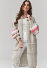 Sweter robiony na drutach z jasnymi paskami w kolorach pomarańczowym, różowym, purpurowym i zielonym. Luźny krój z oversize'owymi rękawami i otwartym przodem.