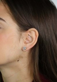 Młoda kobieta o brązowych włosach i delikatnym makijażu patrząca do góry, nosząca pojedynczy diamentowy kolczyk w lewym uchu.