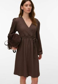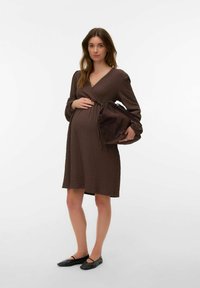Brązowa, teksturowana sukienka ciążowa z długimi rękawami, kopertowym fasonem i wiązanym paskiem w pasie. Modelka obejmuje brzuch, prezentując się z boku.