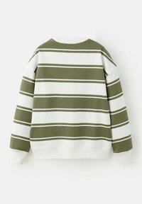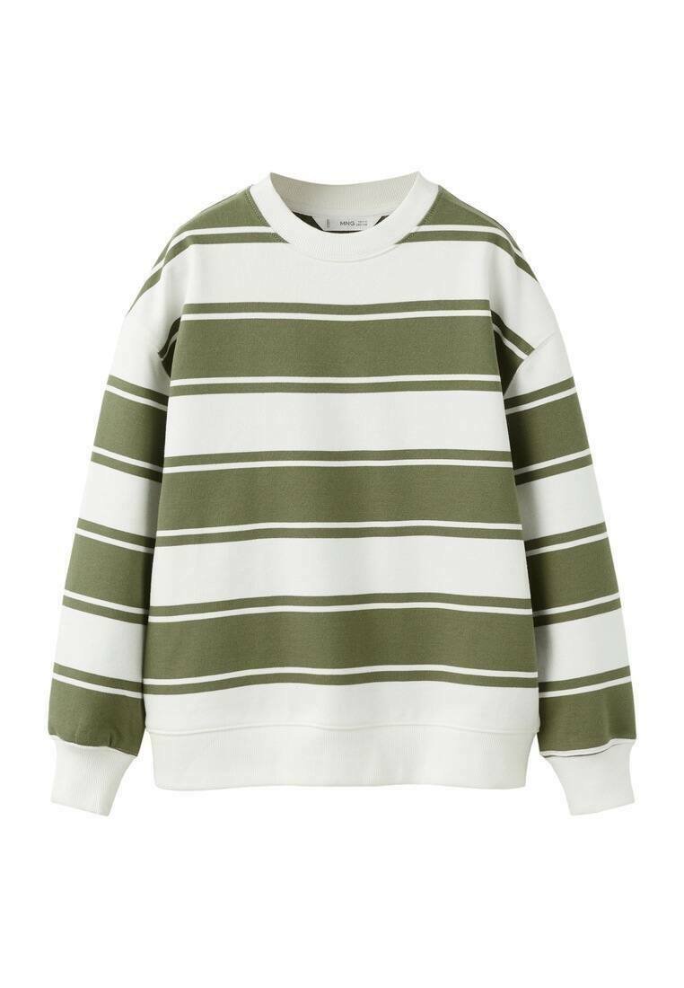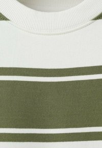 Zielono-biała bluza w paski wykonana z miękkiego materiału, z okrągłym dekoltem, prążkowymi mankietami i luźnym krojem.