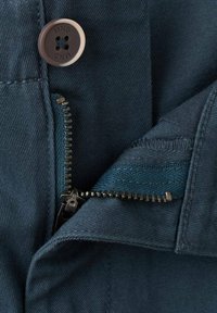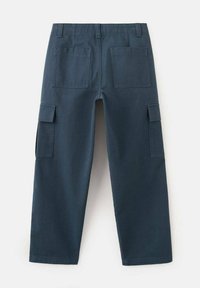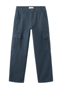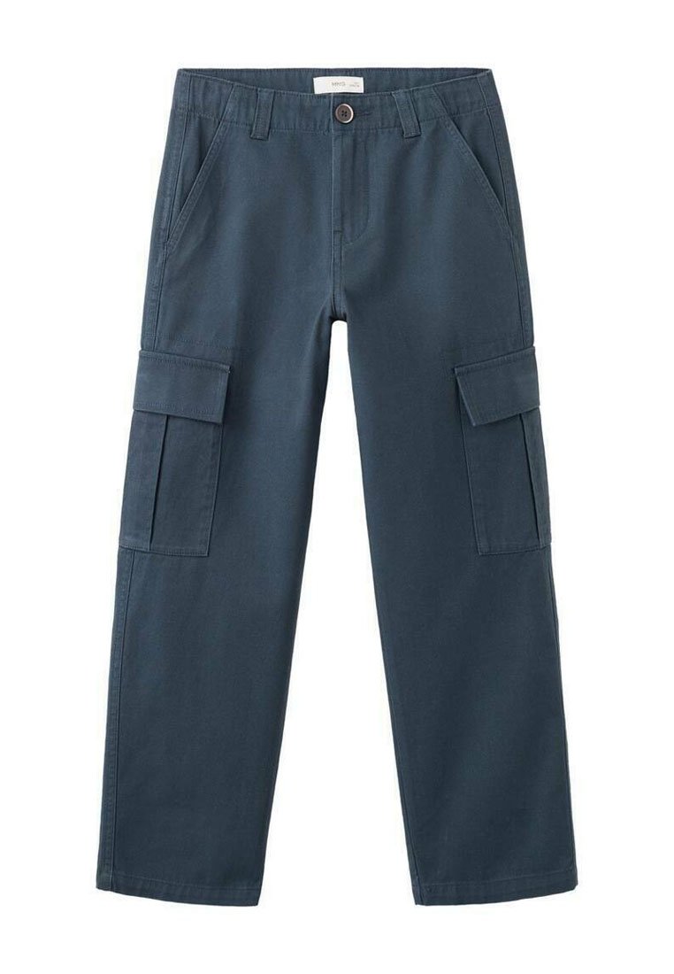 Granatowe spodnie cargo z zapięciem na guziki, przednimi kieszeniami bocznymi oraz klapkowymi kieszeniami na udach, ułożone na płasko na białym tle.