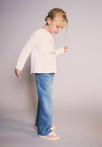 Biała koszula z długim rękawem z kolorowym nadrukiem, niebieskie dżinsy oraz pastelowo-różowe buty wsuwane. Prosta fryzura z warkoczem.