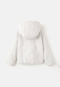 Biała pikowana kurtka z kapturem, dwiema przednimi kieszeniami, zatrzaskami i luźnym krojem. Miękka w dotyku z wzorem diamentowym na całej powierzchni.