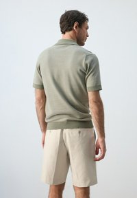 Mężczyzna o krótkich ciemnych włosach, ubrany w jasnorozową, krótką koszulkę polo z krótkim rękawem oraz beżowe szorty do kolan, stojący z rękami w kieszeniach.